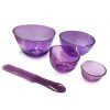 O Kit é composto por 4 cubetas, sendo seus tamanhos de 60ml (mini), 200ml (pequena), 350ml (média), 500ml (grande), e 1 espátula, proporciona ao profissional praticidade na hora de manipular qualquer tipo de produto no recipiente.